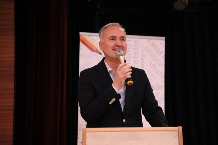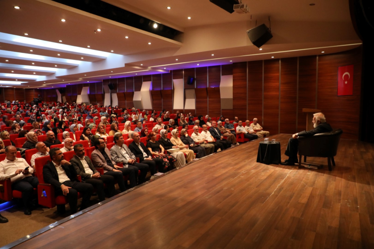 Başkan Taban’ın ardından sahneye Prof. Dr. Sadettin Ökten çıktı. Prof. Dr. Sadettin Ökten, düşünce dünyasını besleyen derin anlatımları ve hayatın içinden verdiği örneklerle yaklaşık 1 saat süren söyleşide dinleyicilere ufuk açıcı mesajlar sundu. Kültür, medeniyet ve insan üzerine geliştirdiği fikirlerle dikkat çeken Prof. Dr. Sadettin Ökten, konuşmasında teoriyi pratiğe bağlayan örneklendirmeleriyle katılımcılara yeni perspektifler kazandırdı. Kimlik ve medeniyet tasavvuru diye bir başlık koyduklarını anımsatan Ökten, bu kimlik ve medeniyet meselesinin kendisinin uzun yıllardan beri zihninde, gönlünde olan bir problem olduğunu ifade etti. Medeniyet tasavvuru ve kimlik ekseninde şekillenen söyleşide, tarihsel bir perspektifle bireyin ve toplumun zihni inşasına dair çarpıcı analizler sunan Prof. Dr. Sadettin Ökten, konuşmasında medeniyet kavramını sadece fiziki unsurlar üzerinden değil, anlam dünyası ve değerler ekseninde ele aldı. Kimliğin bu bağlamda nasıl şekillendiğini de etkileyici örneklerle ortaya koydu. Derinlikli anlatımıyla medeniyetin sadece bir yapı değil, bir iddia ve anlam meselesi olduğuna dikkat çeken Ökten, kimlik inşasının da bu anlam çerçevesinde şekillendiğini ifade etti. Söyleşi boyunca medeniyet ve kimlik ilişkisini hem bireysel hem toplumsal düzlemde irdeleyen Prof. Dr. Sadettin Ökten, tarihsel örnekler ve düşünsel çözümlemelerle dinleyicilere güçlü mesajlar verdi. Akademik birikimini sade ve anlaşılır bir dille aktaran Ökten, örneklerle zenginleştirdiği anlatımıyla dinleyicilerin zihninde kalıcı izler bıraktı.
