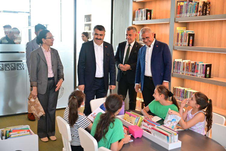 Yıldırım Belediye Başkanı Oktay Yılmaz ile birlikte önce Mümine Şeremet Uyumayan Kütüphanesi’ni ziyaret eden AK Parti MKYK Üyesi Hilmi Türkmen; 24 saat hizmet veren, ücretsiz çay ve çorba ikramlarının yapıldığı kütüphane hakkında bilgi alıp, gençlerle sohbet etti.