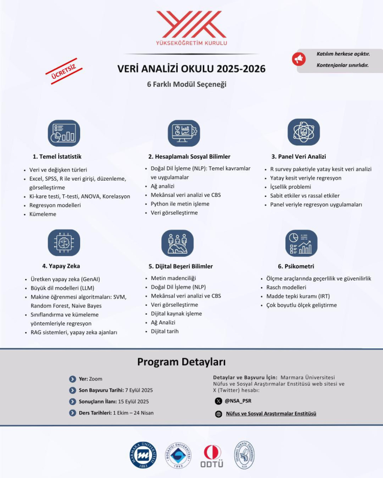 Zoom üzerinden yapılacak dersler için Marmara Üniversitesi Nüfus ve Sosyal Araştırmalar Enstitüsü web sitesi ile son başvuru tarihi 7 Eylül 2025 olarak açıklandı.